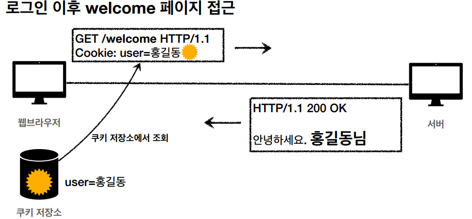 클라이언트는 쿠키 저장소의 유저 정보 꺼내 Cookie 헤더에 담아 서버에 요청 전달