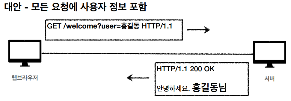 모든 요청에 사용자 정보를 포함 => 번거로운 개발 + 보안 문제 발생 가능