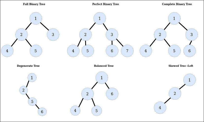 전 이진 트리, 완전 이진 트리, 포화 이진 트리, 균형 이진 트리, 편향 이진 트리