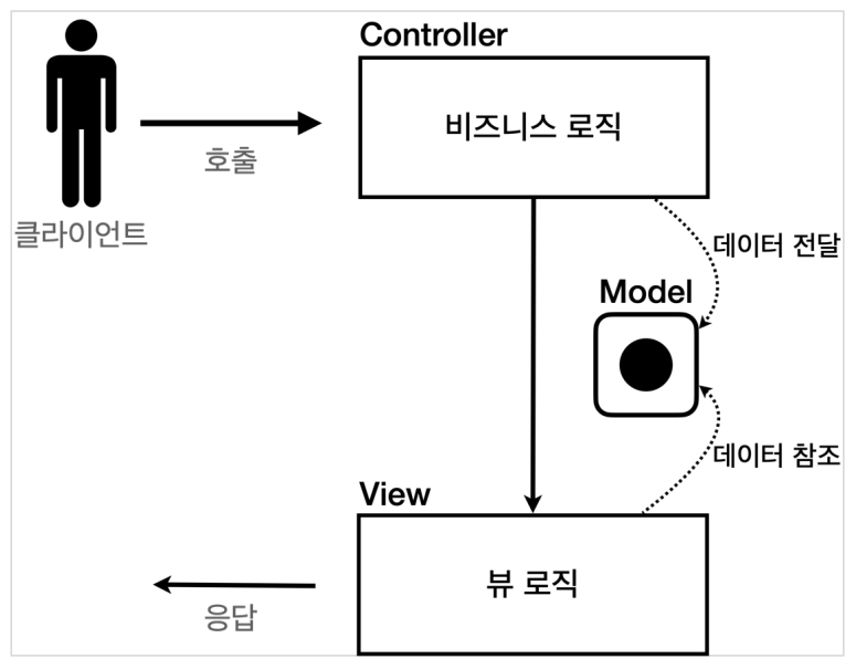 모델: 뷰에 출력할 데이터를 담아둠 => 뷰는 비즈니스 로직이나 데이터 접근을 몰라도 되고, 화면 렌더링에 집중