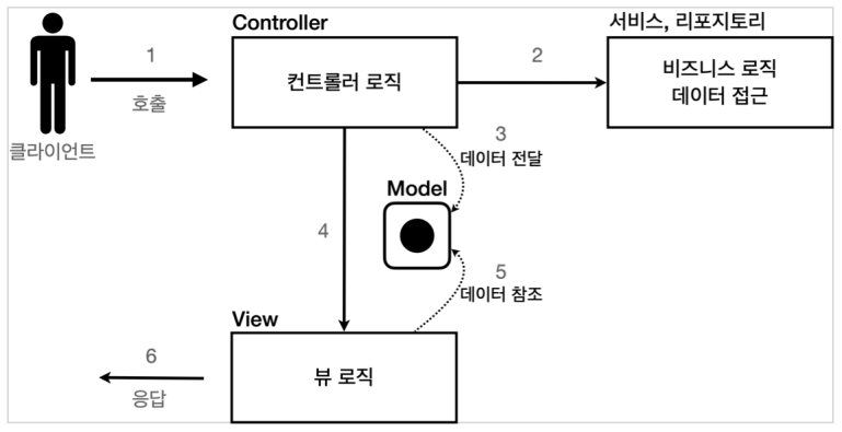 컨트롤러: HTTP 요청을 받아 파라미터 검증, 비즈니스 로직 실행 → 뷰에 전달할 결과 데이터를 조회해 모델에 담음