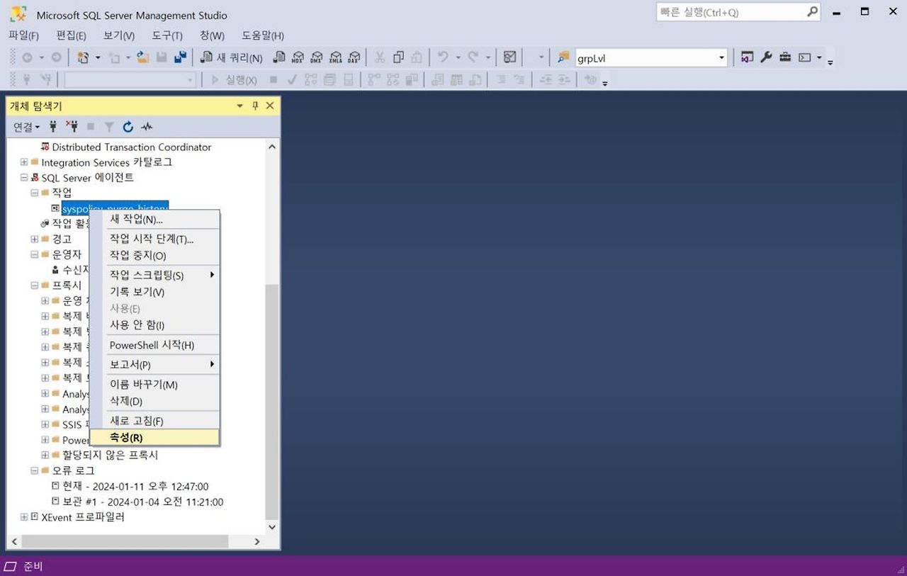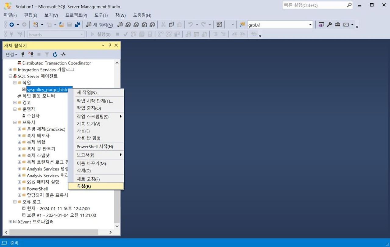 1. [SQL Server 에이전트] 우클릭 - [속성]