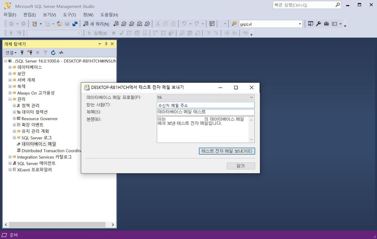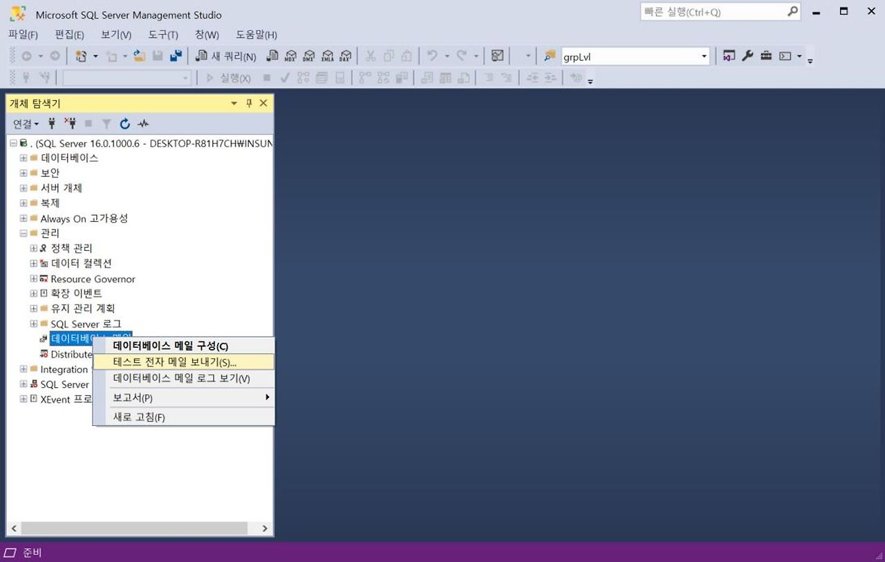 1. [관리] - [SQL Server 로그] - [데이터베이스 메일] 우클릭 - [테스트 전자메일 보내기]