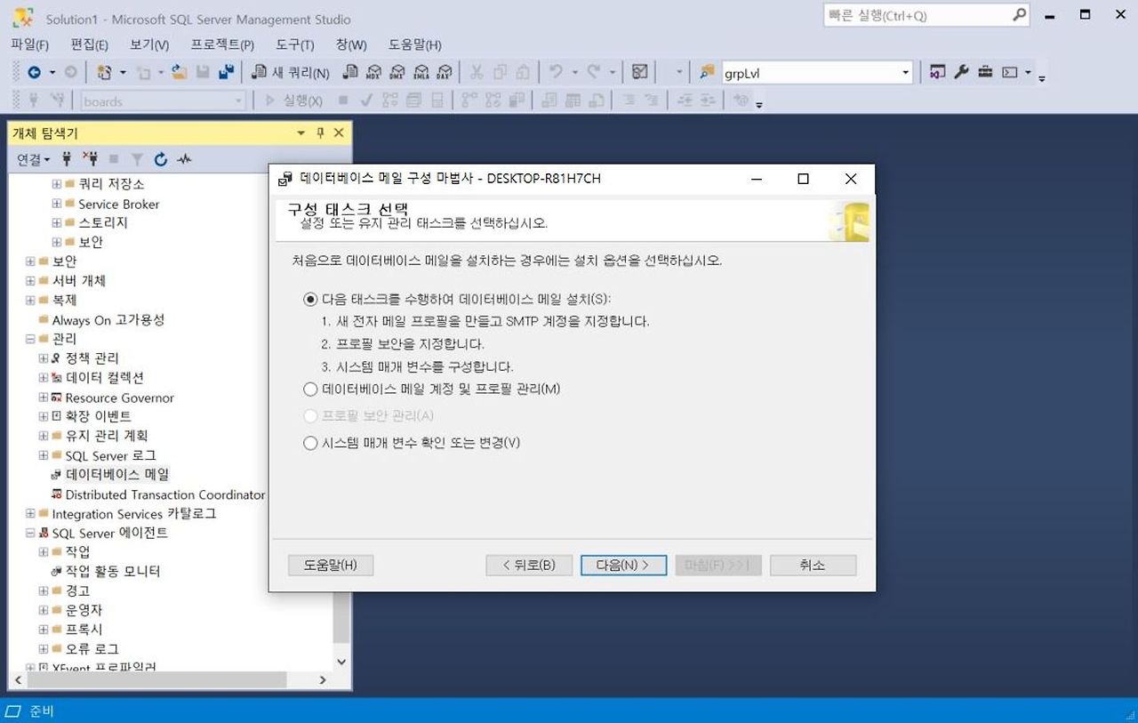 2. [다음 태스크를 수행하여 데이터베이스 메일 설치] - [다음]