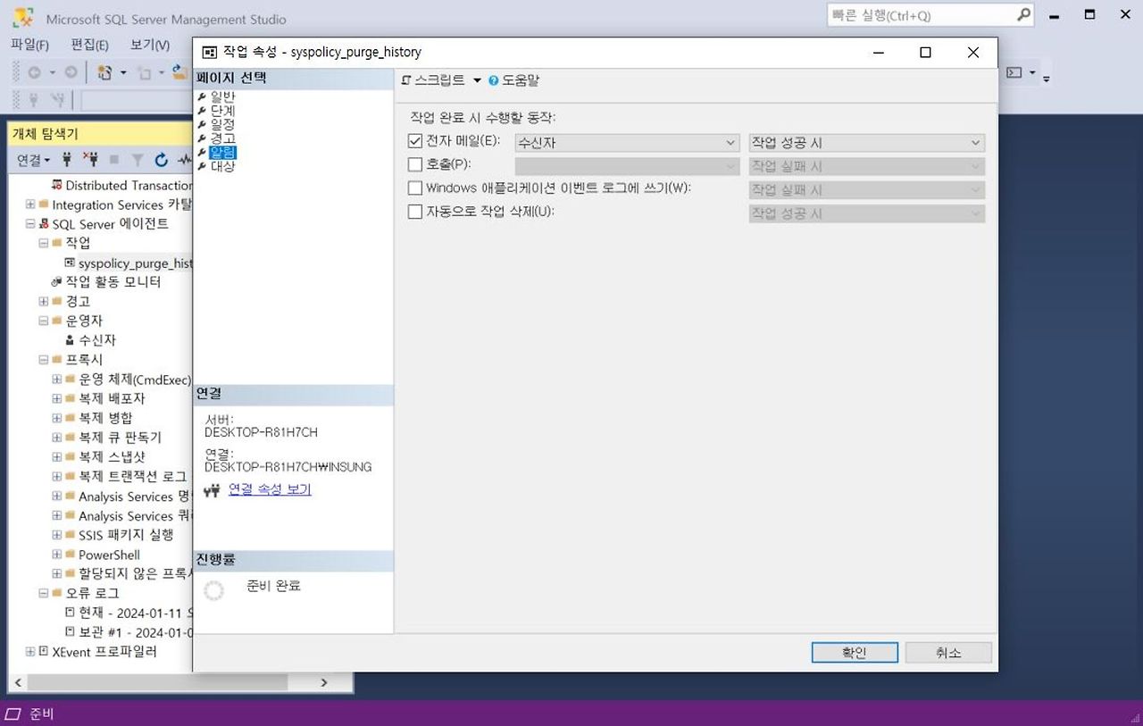 1. [SQL Server 에이전트] - [작업] - 모니터링할 작업 우클릭 - [속성]