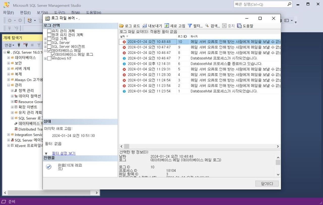 [관리] - [SQL Server 로그] - [데이터베이스 메일] - [데이터베이스 메일 로그 보기]