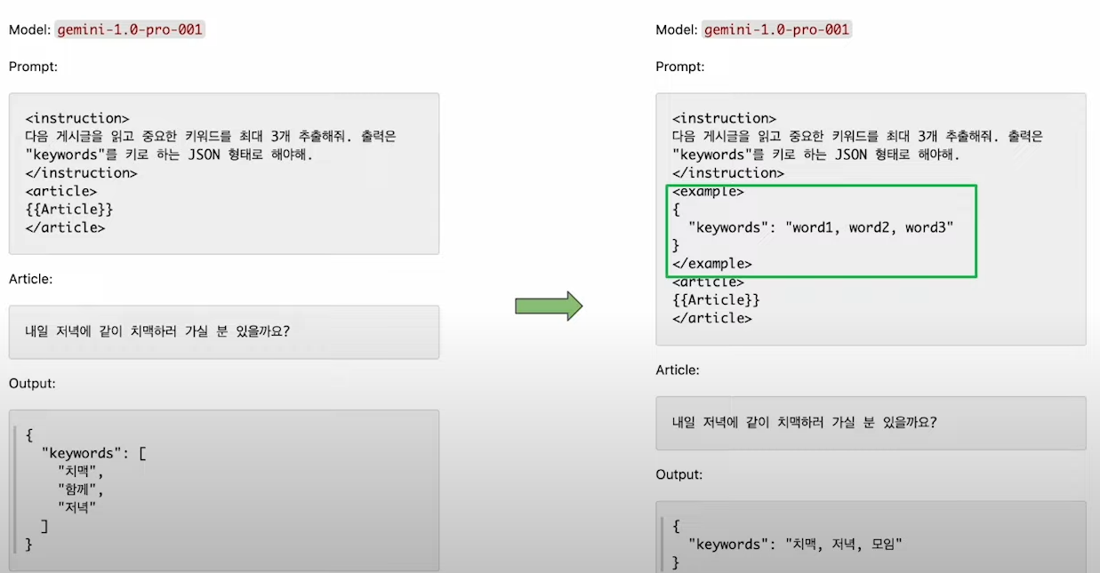 => 이해, 출력 형식 설명을 위한 1~2개의 예시만 제한적으로 사용하는 것을 추천함