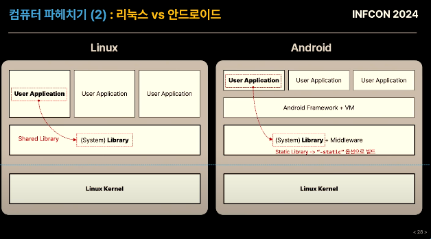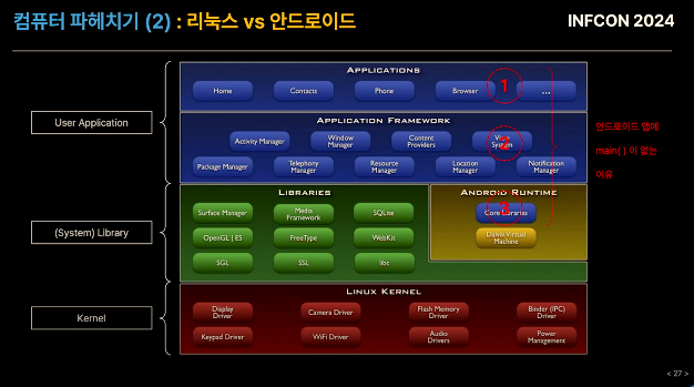 안드로이드 => 앱이 직접 실행을 시작하는 구조가 아닌, 시스템 라이브러리가 실행 시작하는 구조